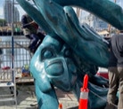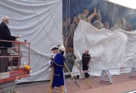 Unveiling day was a major event, the town closed the road, TV cameras showed up to tape it for broadcast, seniors centre and old folks homes brought in the seniors on a bus that was donated for the event. Local businesses provided refreshments. Young people from the local youth club were on the roof of the building to pull up the tarps when ready, youth from the local First Nations community were out dance a blessing with the support of a huge honor drum and drummers.